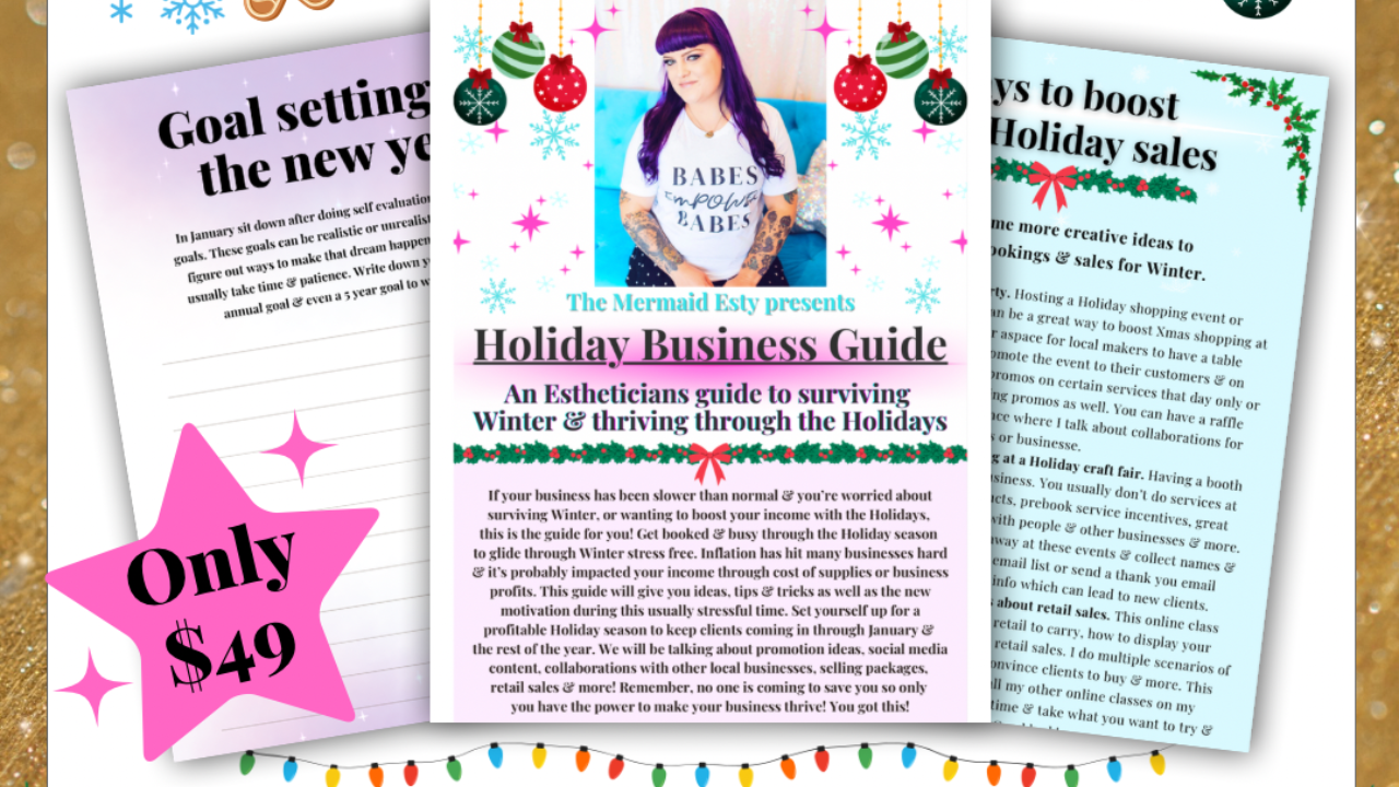If your business has been slower than normal & you're worried about surviving Winter, or wanting to boost your income with the Holidays, this is the guide for you! Get booked & busy through the Holiday season to glide through Winter stress free. Inflation has hit many businesses hard & it's probably impacted your income through cost of supplies or business profits. This 18 page guide will give you ideas, tips & tricks as well as the new motivation during this usually stressful time. Set yourself up for a profitable Holiday season to keep clients coming in through January & the rest of the year. We will be talking about promotion ideas, social media content, collaborations with other local businesses, selling packages, retail sales & more! I also talk about Valentine's Day prep & promo ideas. Remember, no one is coming to save you so only you have the power to make your business thrive!